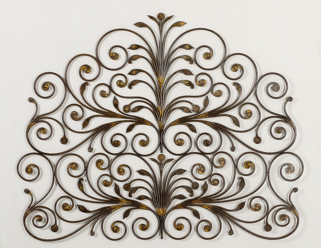 SoldCasa e Giardino, Grande specchiera in ferro a volute e riccioliGrande specchiera da parete Ferro forgiato e verniciato, vetro colorato specchiato. 1950 ca. cm 186x132See Sold Price