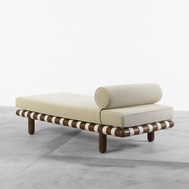 SoldT.H. Robsjohn Gibbings (Attrib), daybedT.H. Robsjohn Gibbings (Attrib), daybed, 20th c., white lacquered wood tubular frame, webbed mattress support, with geometric design cushion and bolster pillows, unmarked, 16.25"h x 80.25"w x 28.5"d PSee Sold Price