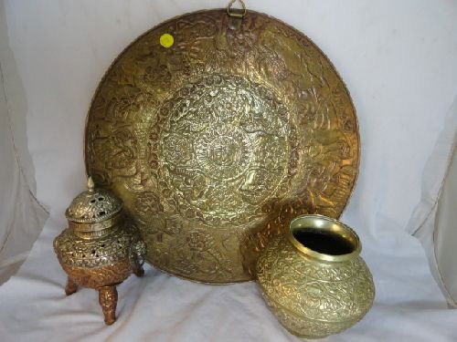 THAI COPPER AND SILVER CENSOR, BRASS VASE AND
