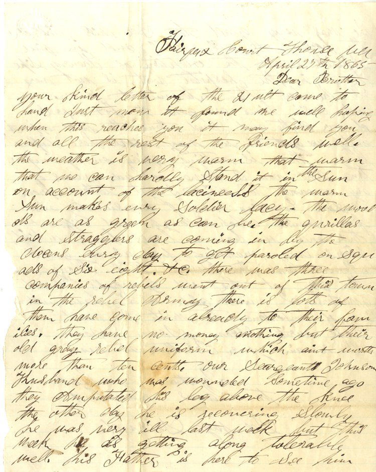 1862 Letters: doing his duty at Harper's FerryMar 02, 2026Ohio Infantryman letter, Andrew Jackson mentionedMar 02, 20261864 Albert Skeel New York 22nd Cavalry LetterMar 02, 20261865 Camp of 23rd Regiment Black soldier letterMar 02, 2026W.A. Douglass to Sarah McQuinton, Ohio lettersMar 02, 2026Sgt. William A Hosford 2nd CT Heavy Artillery, letterMar 02, 2026Zephram Lavier, William C. Chamberlain NY lettersMar 02, 2026Reuben T. Wells E Co. NY 115th Infantry, etc. lettersMar 02, 2026New England Civil War: Patriotic letter to brother, etcMar 02, 20261863 George Dixon happy enemy retreated, etc.Mar 02, 2026David Kagey 25th VA Confederate Hospital StewardMar 02, 2026Ineffectiveness of Union shells on Ft. Sumter, etc.Mar 02, 2026Dr. Mudd, Samuel Arnold, and Ned Spangler letterMar 02, 2026Captured, POW, & died 2 weeks later letter, etc.Mar 02, 2026Indianapolis Soldiers' Death & Minnesota War lettersMar 02, 2026Pvt. Henry Boteler Louisville, KY Rockbridge ArtilleryMar 02, 2026