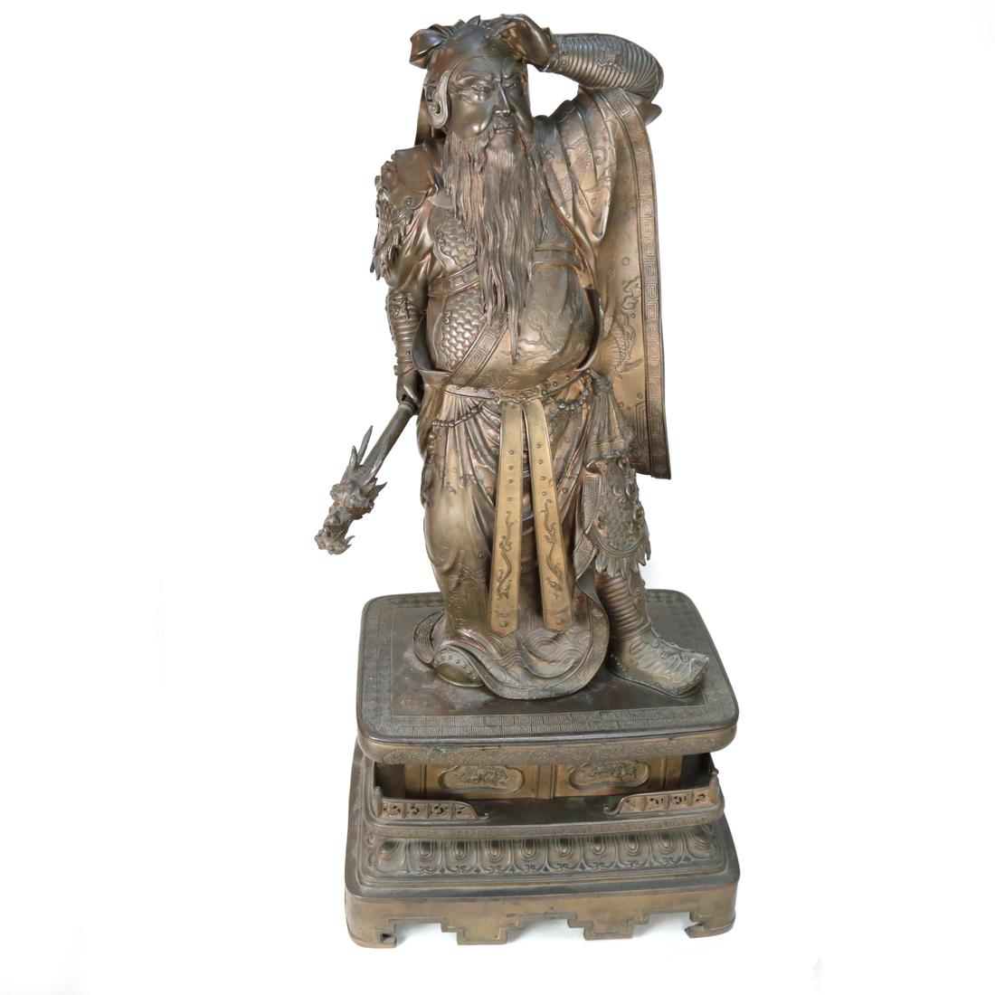 SoldChinese Monumental Bronze Palace Guard FigureDepicts a Chinese warrior in full armor holding a dragon staff, atop a temple. [Base: 11"; Figure: 27 1/2"; Overall: 38"].See Sold Price