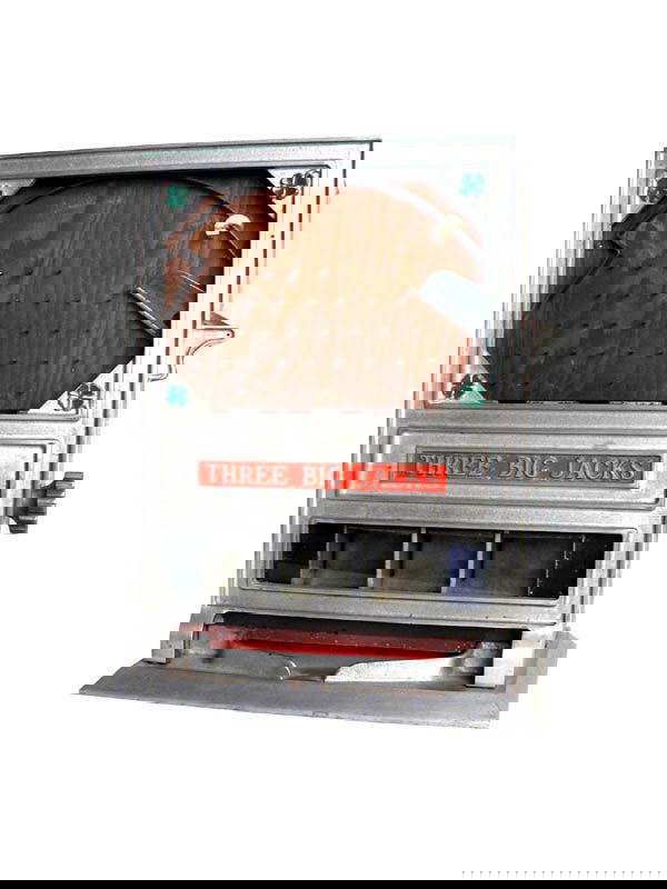 SoldThree Jacks 1 Cent Machine.Three Jacks 1 Cent Machine. Circa 1930. Flip a penny in one of the three pockets and turn the handle to dump the coins out. No back door, machine nailed to the stand. 51”h. Working. Good.See Sold Price