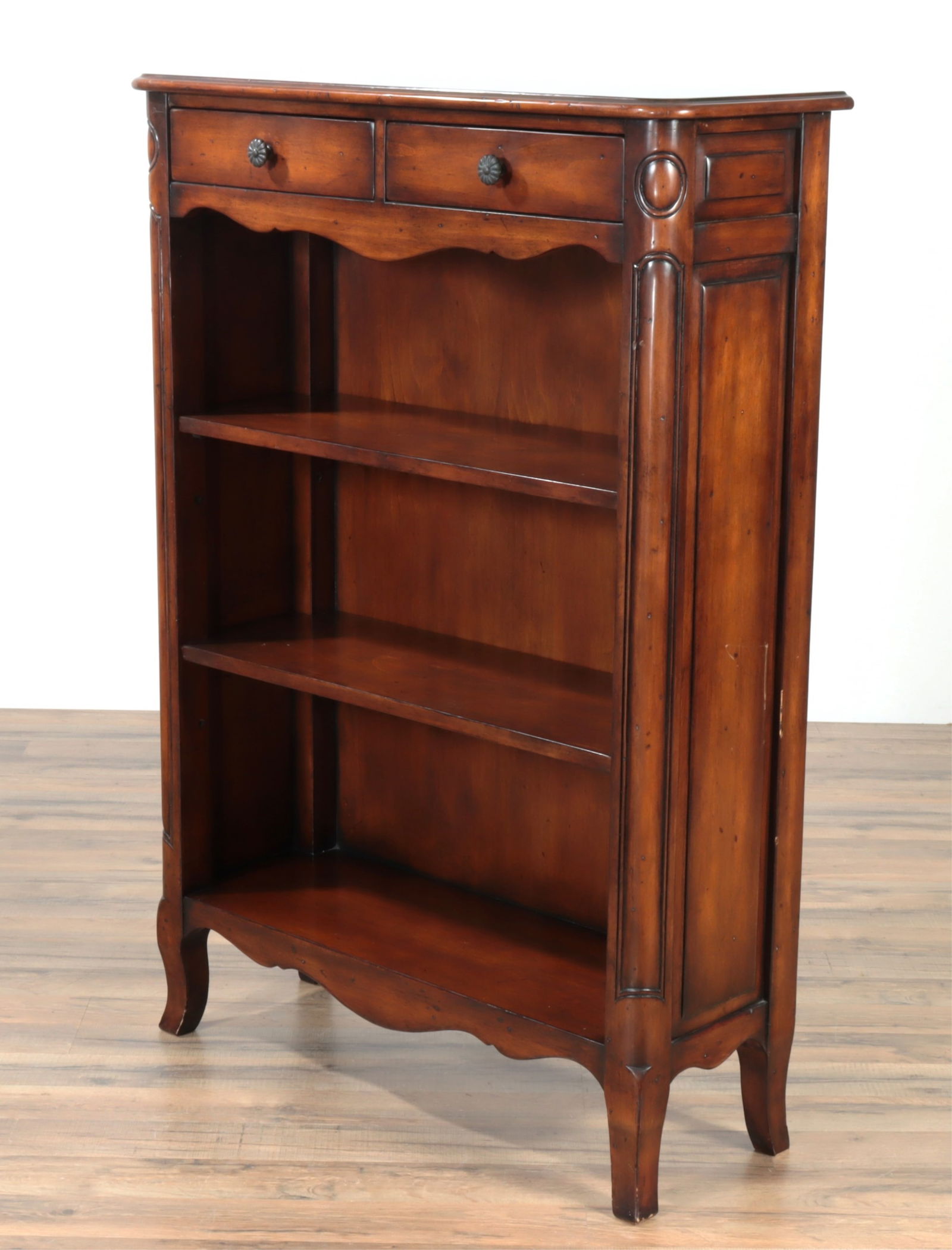 SoldSigned Theodore Alexander Bookcase.The bookcase has one drawer, one adjustable shelf, and one fixed lower shelf. The knobs are wooden. There are floral carvings on the piece. It measures 24" wide, 22 1/2" deep, and 36" tall. Third-partSee Sold Price