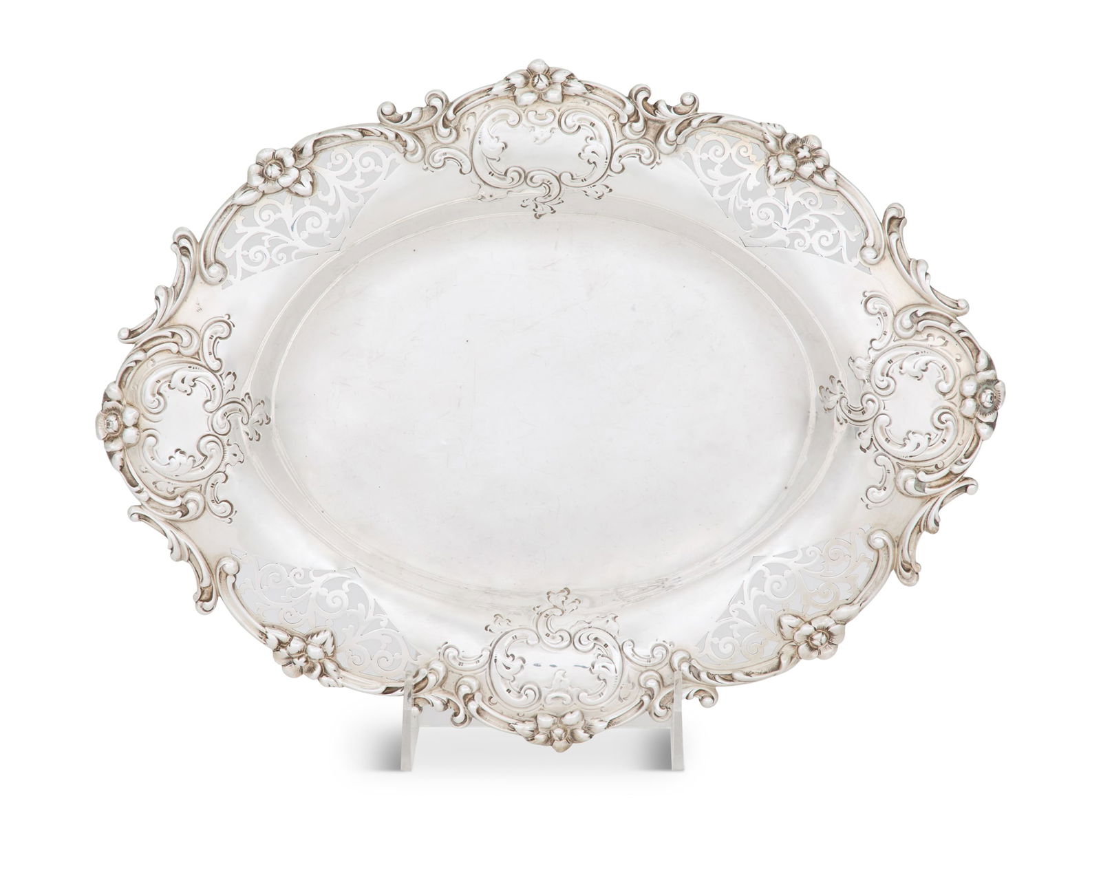 SoldAmerican Theodore B. Starr sterling silver centerpiece,American Theodore B. Starr sterling silver centerpiece of shaped quatrefoil form with pierced details enclosed by chased scrolls and shells, and raised on figural supports, 6"h x 14.75"w x 10.25"d, 26See Sold Price