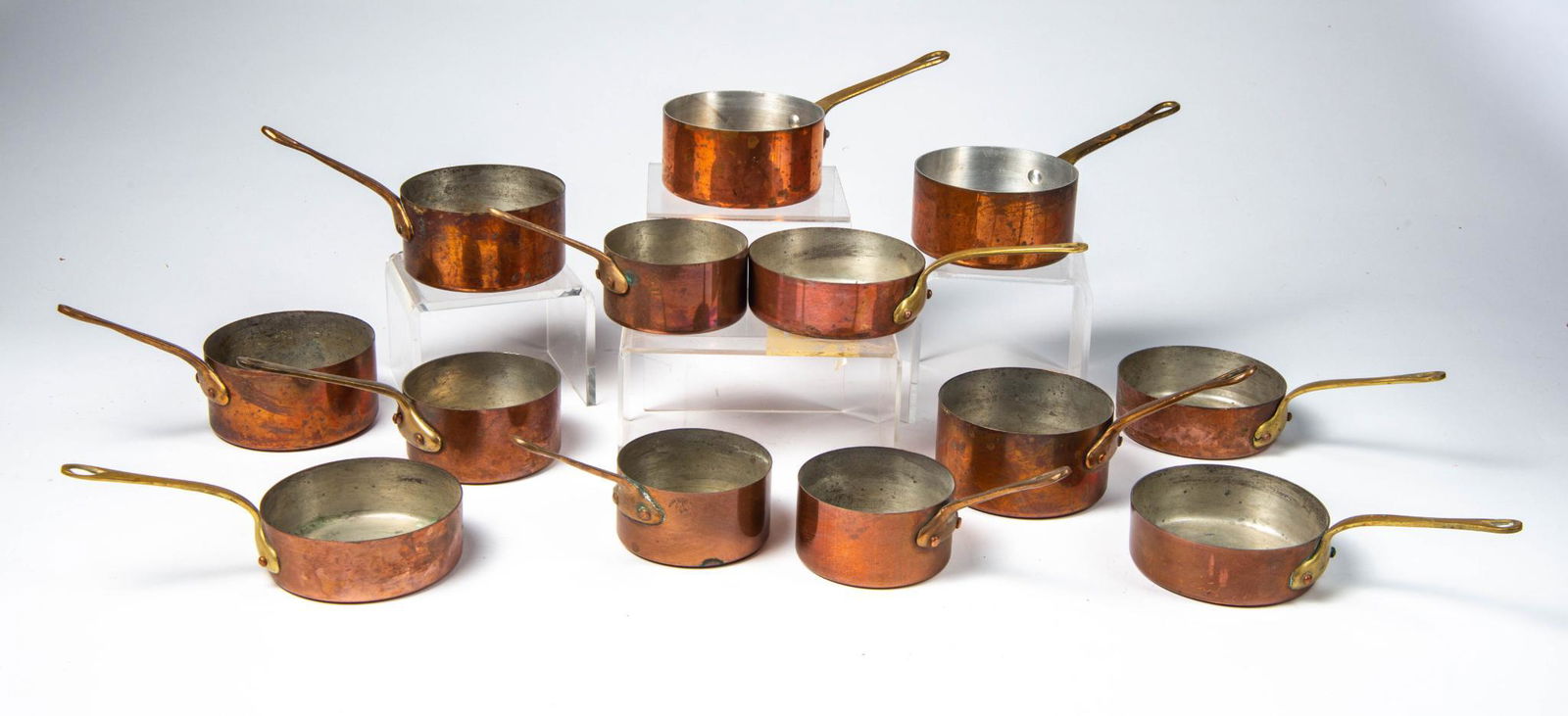 Thirteen Miniature Copper Saucepans.