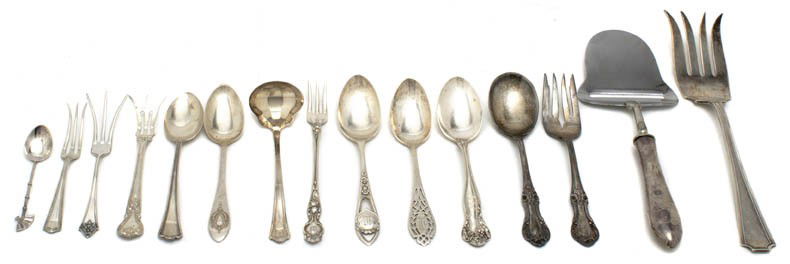 SILVER: Thirty-two souvenir spoons and utensils, English, American, and Continental, some with enameSILVER: Thirty-two souvenir spoons and utensils, English, American, and Continental, some with enamel and goldwash, including sixteen sterling, four continental silver, one French, one Russian, five w