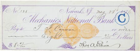 Thomas Edison Check Signed "Thos. A. Edison", 8"