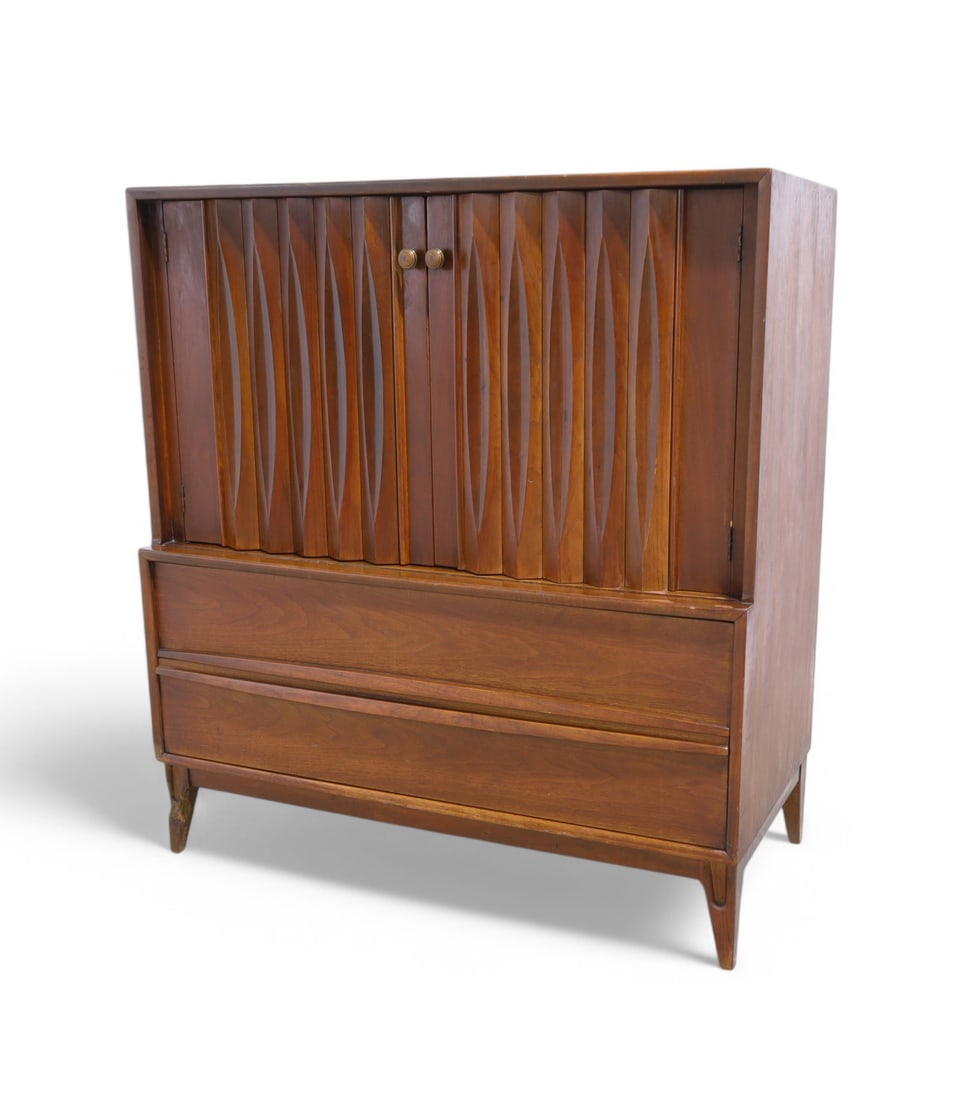 SoldLane Brutalist walnut high chestLane Brutalist walnut high chest, 5 drawers, 54"h x 34"w x 18"d, light wear to finishSee Sold Price