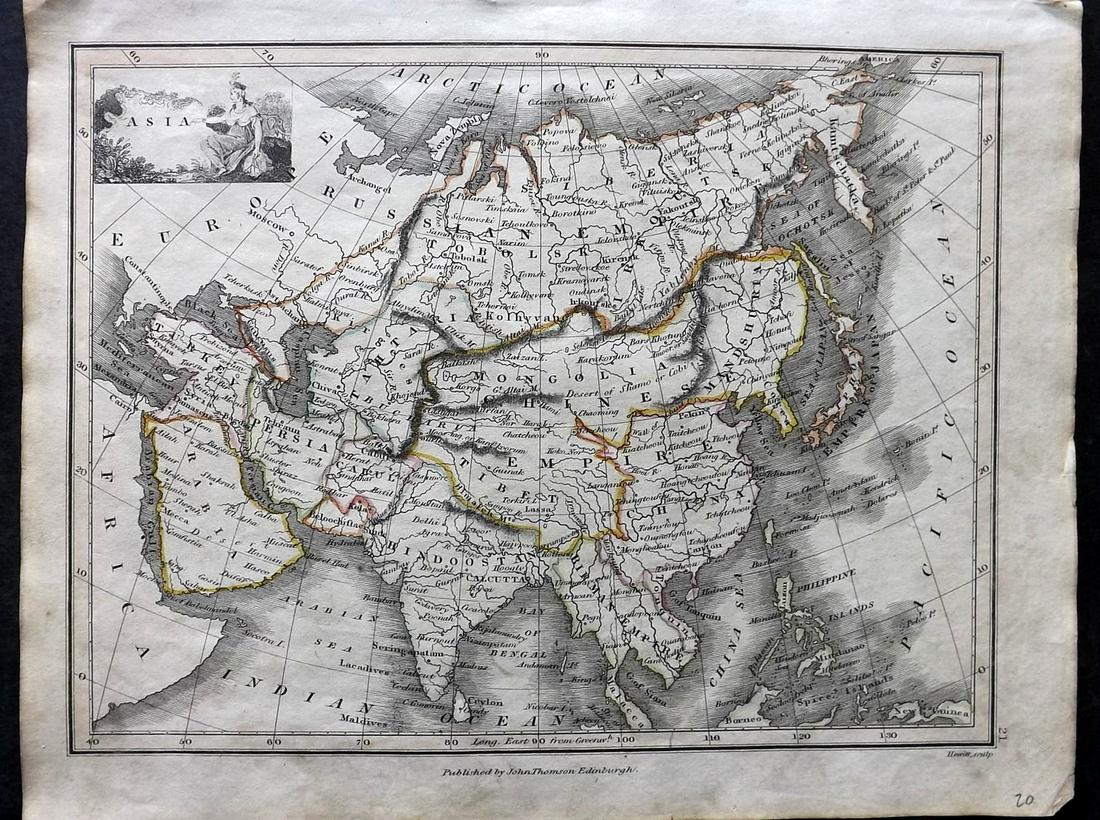 SoldThomson, John (Pub) 1825 Hand Col Map of AsiaCopper Engraved Map Published 1825 by John Thomson, Edinburgh for "The Edinburgh School Atlas" by N. R. Hewitt. Maps Engraved by Hewitt. Engraved Vignette in corner. Original Outline Hand Colour. RareSee Sold Price