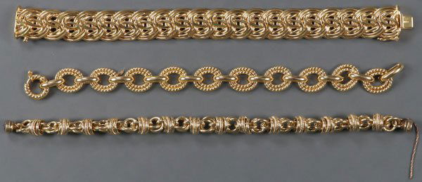 SoldThree 14kt. Gold Bracelets, Curb, Woven, and Byzantinestamped "14k", 14kt. yellow gold Byzantine, 7-1/4 in., 32.9 grams; 14kt. yellow gold woven, 8 in., 13.6 grams; 14kt. yellow gold curb link, 7 in., 28.3 grams Provenance: Private Collection, Canton, NSee Sold Price