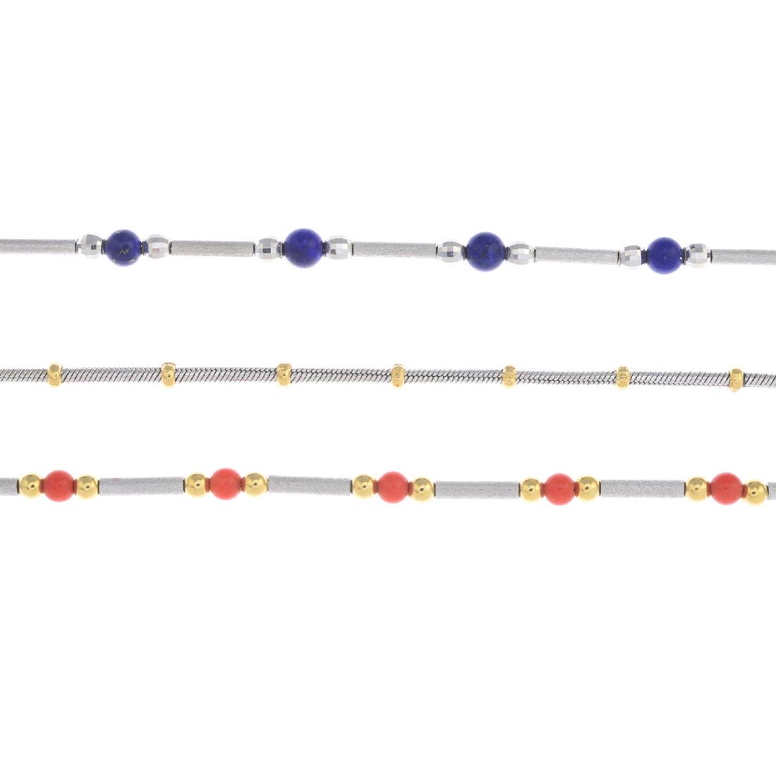 Three 18ct gold gem-set bracelets. To include a coral