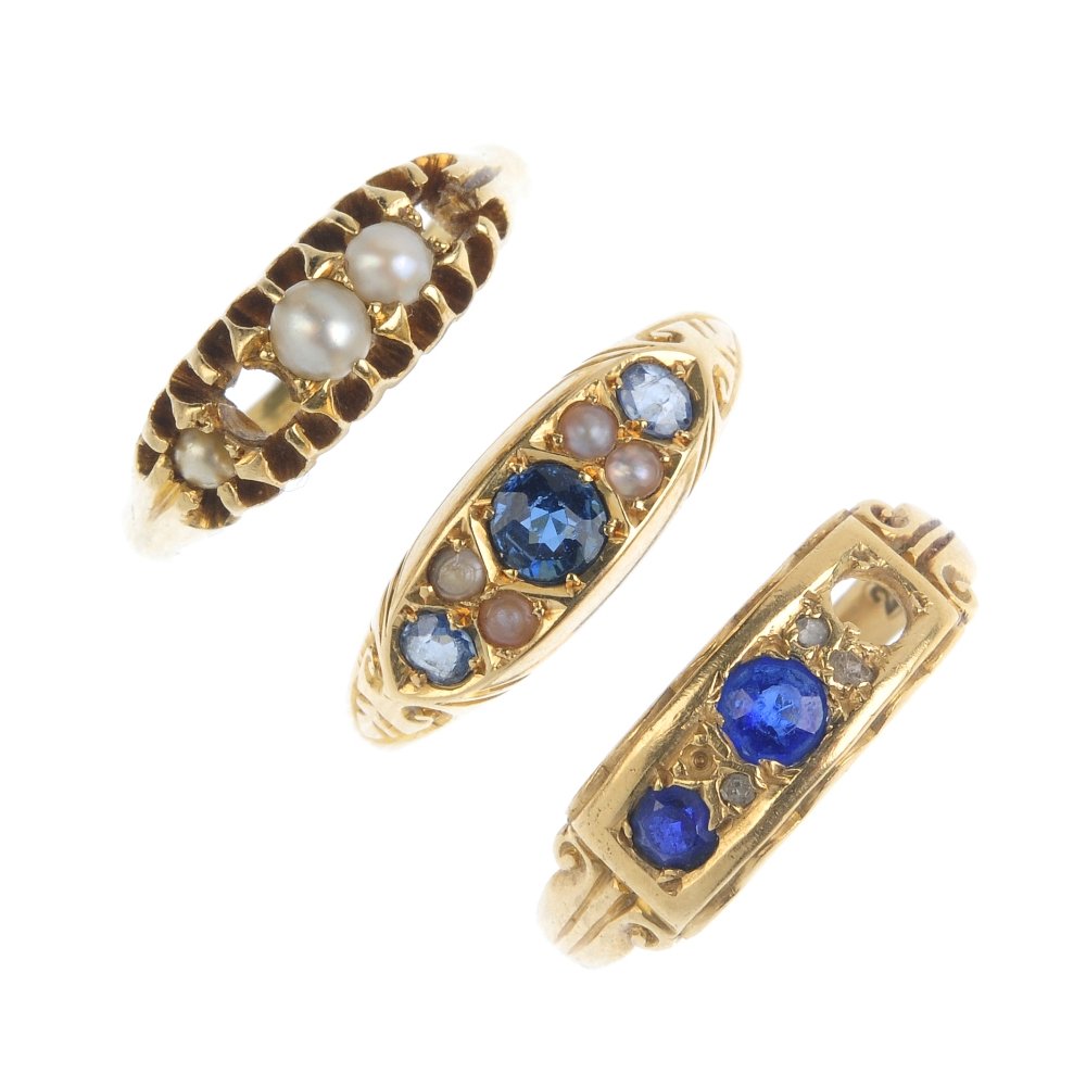 Three 18ct gold gem-set rings. To include a three-stone