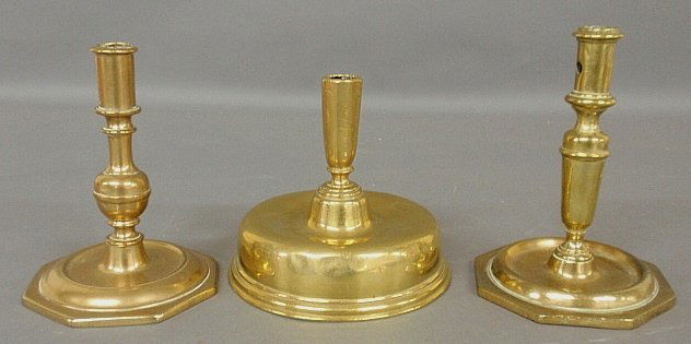 Three 18th c. brass candlesticks, two with octagonal ba