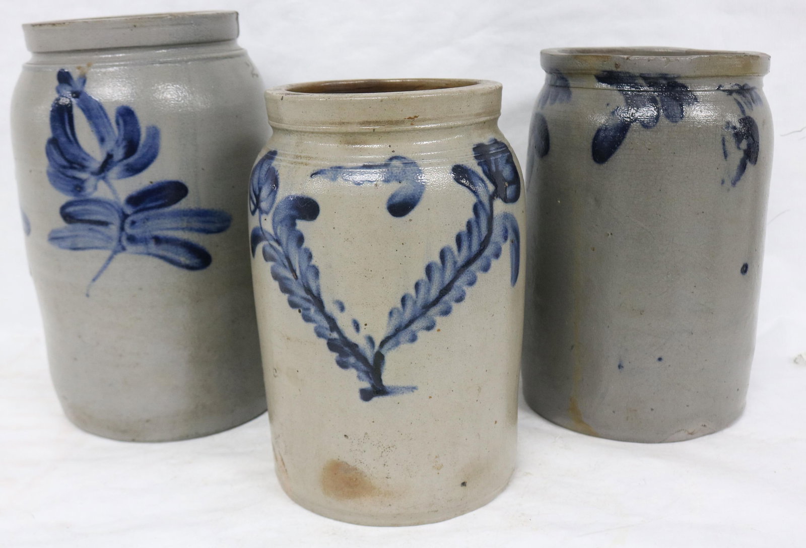 THREE 19TH C. BLUE DECORATED STORAGE JARS,