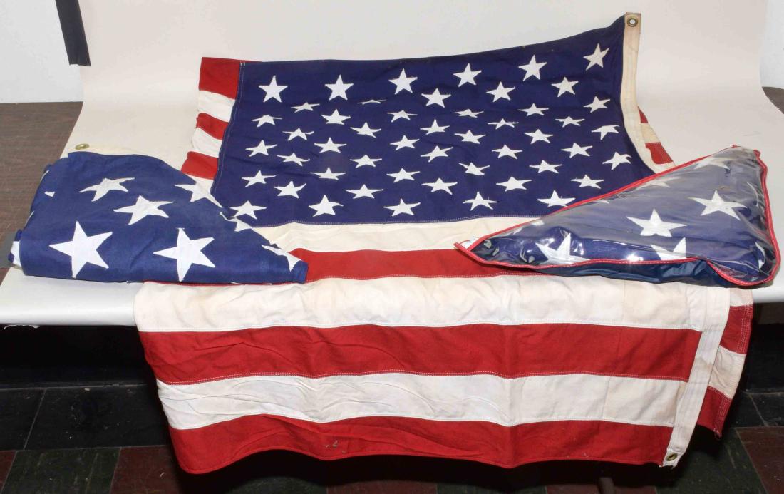 Sold7 VINTAGE 48 STAR AND HAND STITCHED AMERICAN FLAGSGroup of 7 mid 20th century American flags, 3 showing 48 stars, while others showing hand stiched 50 stars; largest 53"x113" smallest 22"x34"; Condition: some flags show toning and wear, no observed tSee Sold Price
