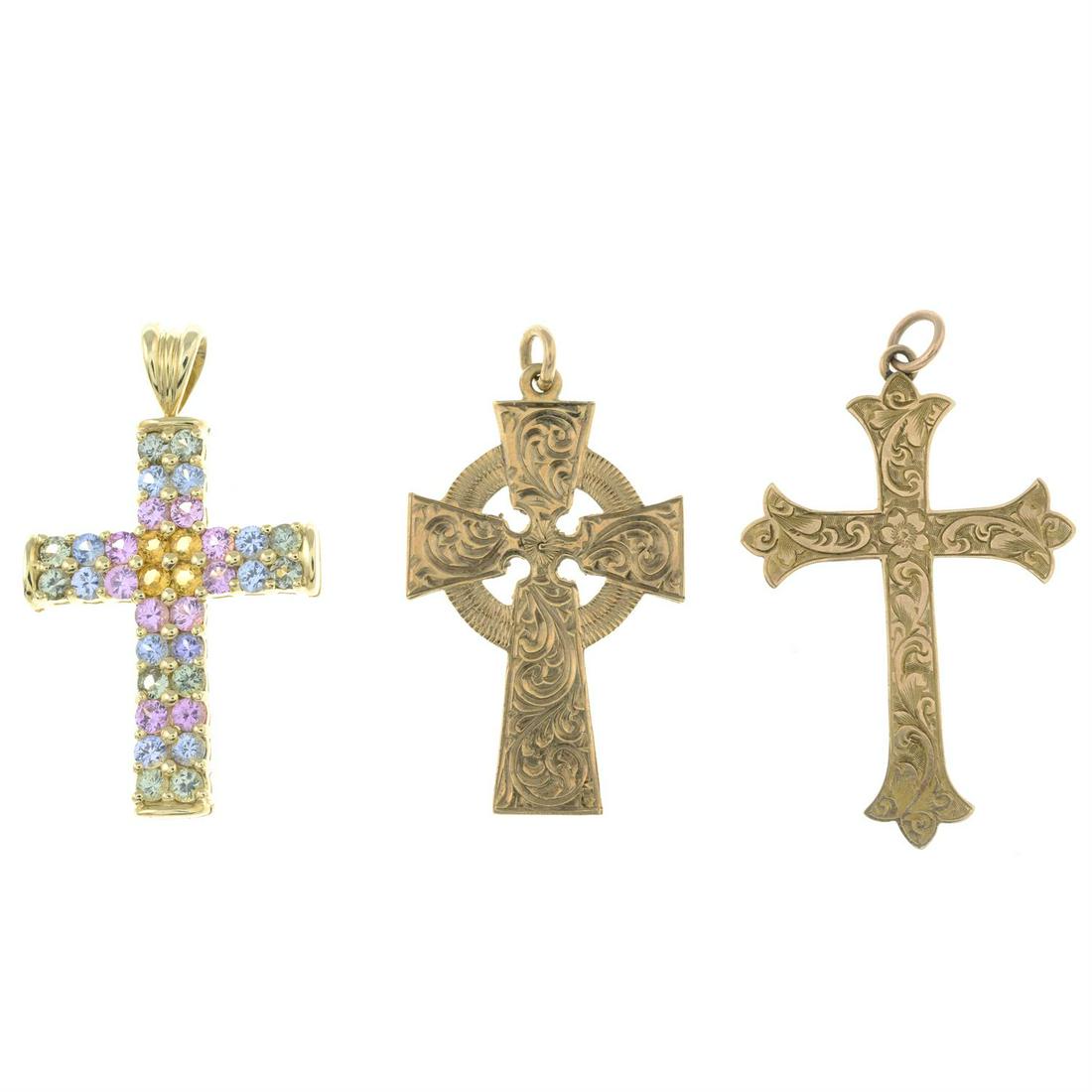 Three 9ct gold cross pendants.