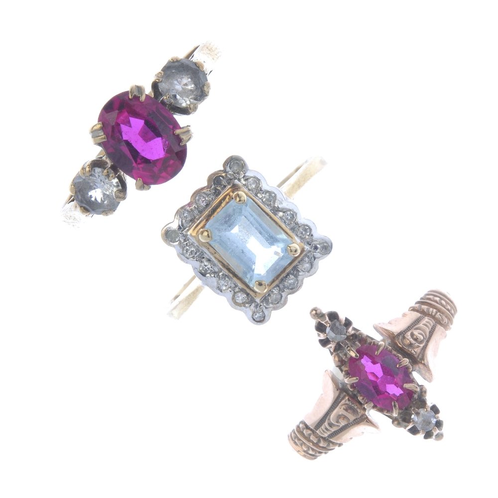 Three 9ct gold diamond, paste and gem-set rings. To