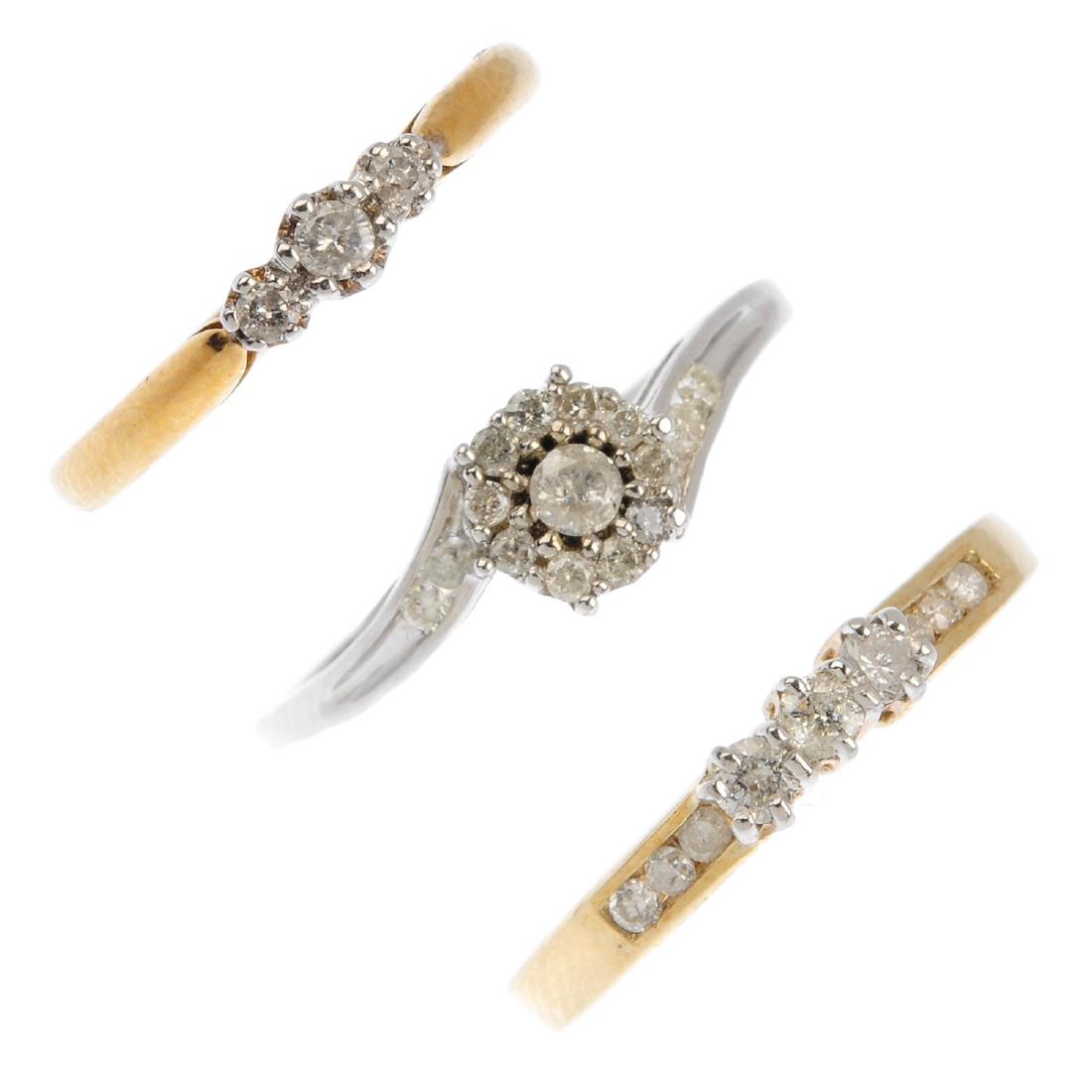Three 9ct gold diamond rings. To include a crossover