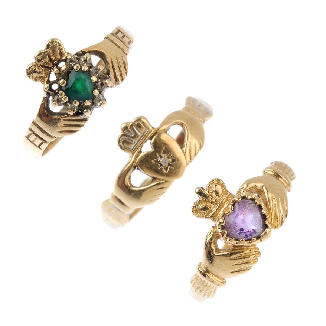 Three 9ct gold gem-set Claddagh rings. Each set with