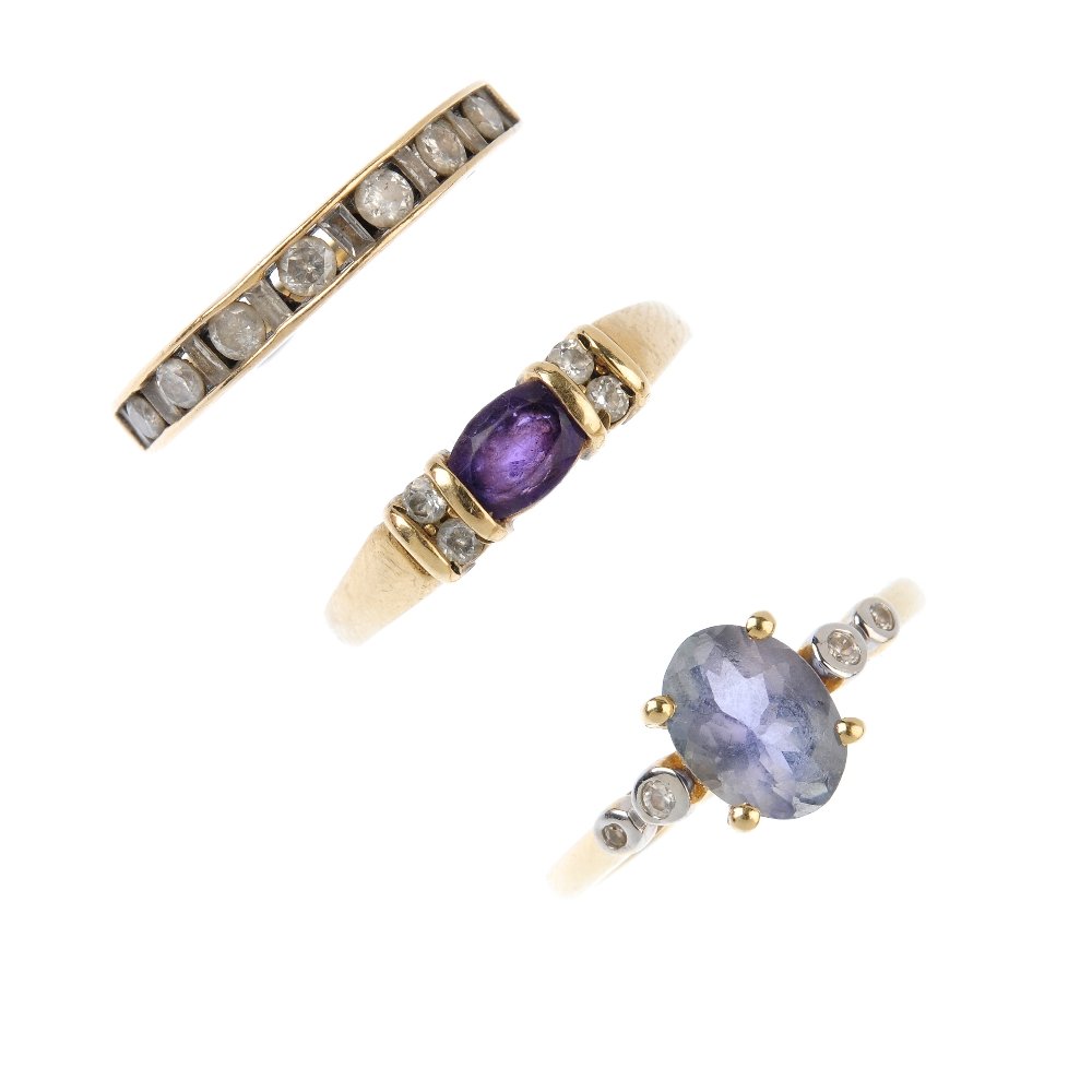 Three 9ct gold gem-set rings. To include a brilliant