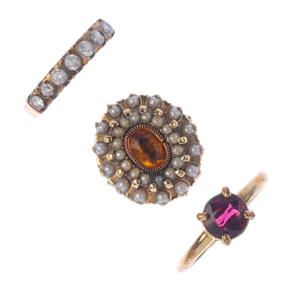 Three 9ct gold gem-set rings. To include a garnet