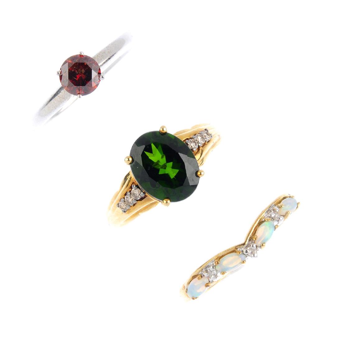 Three 9ct gold gem-set rings. To include a