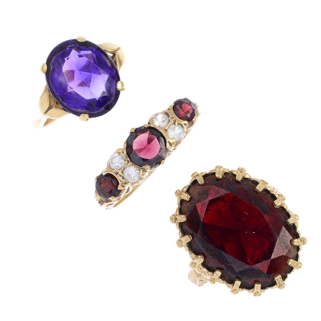 Three 9ct gold gem-set rings. To include an amethyst