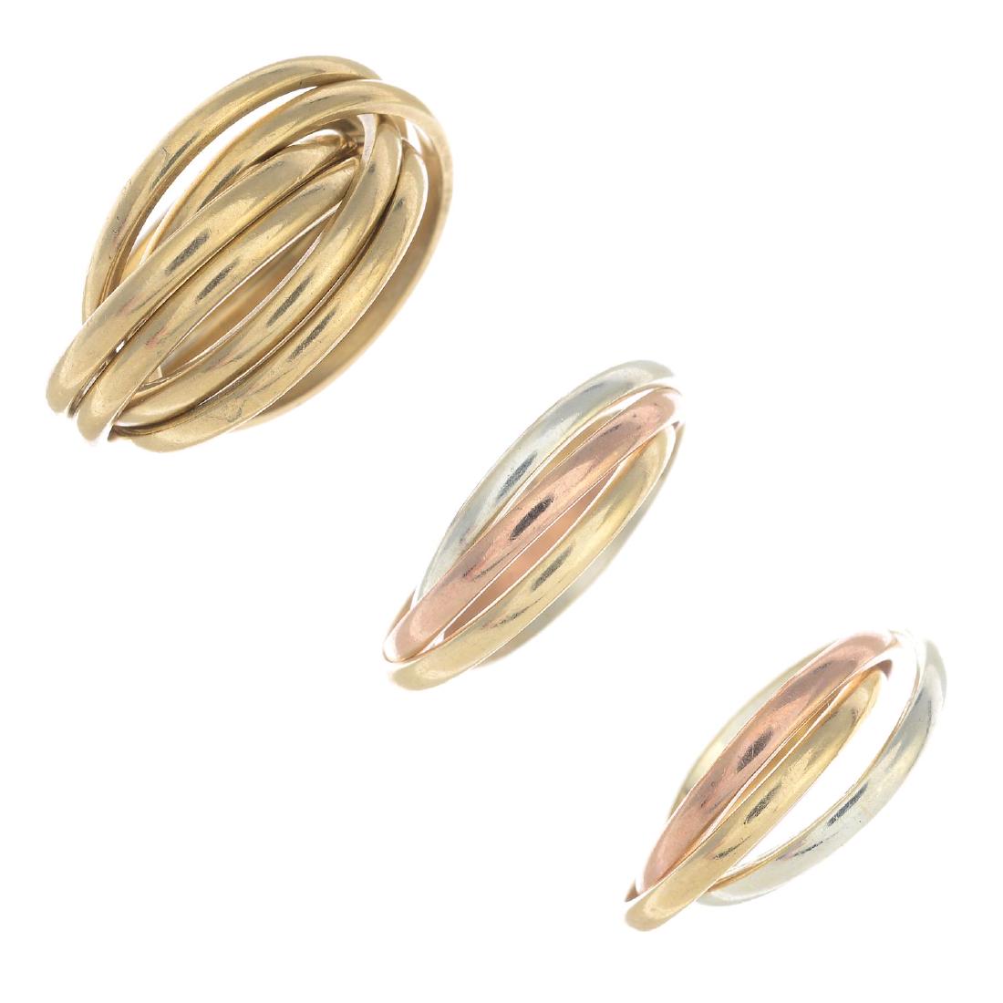 Three 9ct gold rings. Each comprising interwoven bands.