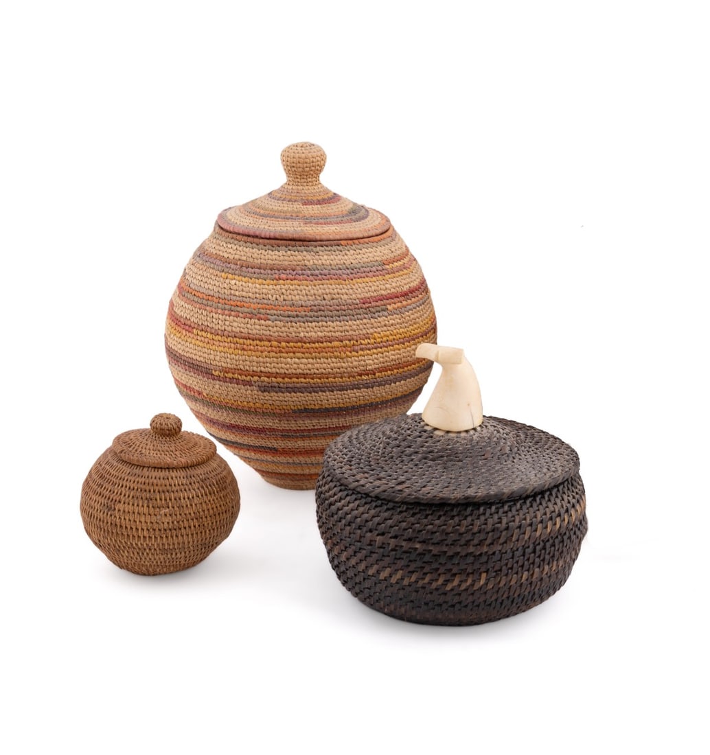 THREE ALASKAN LIDDED BASKETS, INCLUDING JOHN LONG