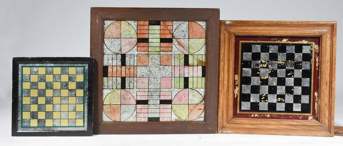 THREE AMERICAN FRAMED REVERSE PAINTED GLASS GAME