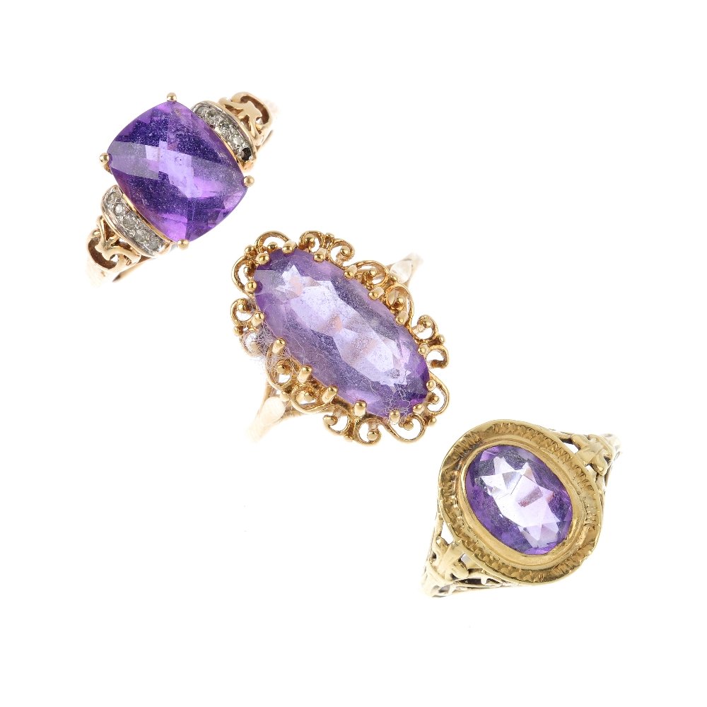 Three amethyst rings. The first designed as an