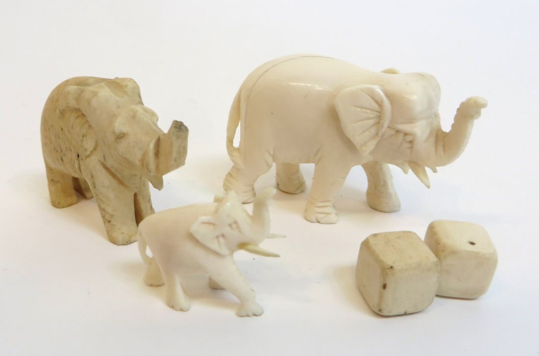Three Antique Ivory Elephants & Two Dice