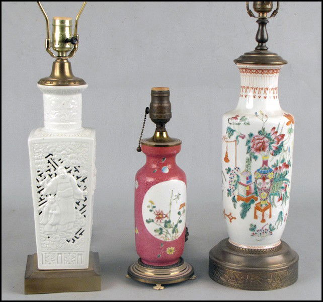 THREE ASIAN PORCELAIN TABLE LAMPS.