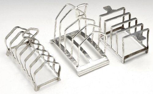 SoldTWO SILVER TOAST RACKS and a silver plated rack. Sheffield 1932 & Birmingham 1933. 322 grams overallTWO SILVER TOAST RACKS and a silver plated rack. Sheffield 1932 & Birmingham 1933. 322 grams overall. Largest 14 cm x 10 cm. (3)See Sold Price