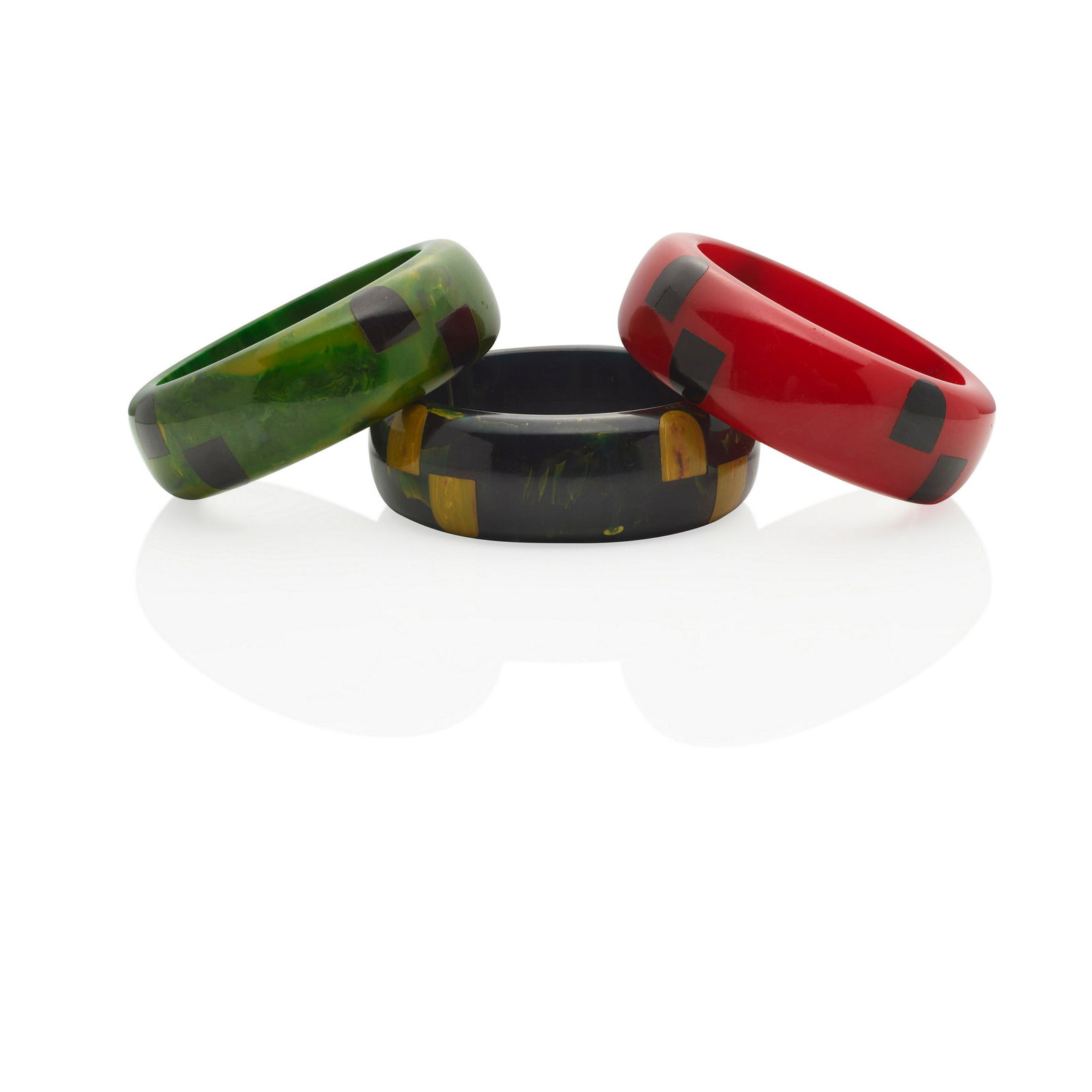 THREE BAKELITE MODIFIED 'DOT' BANGLE BRACELETS