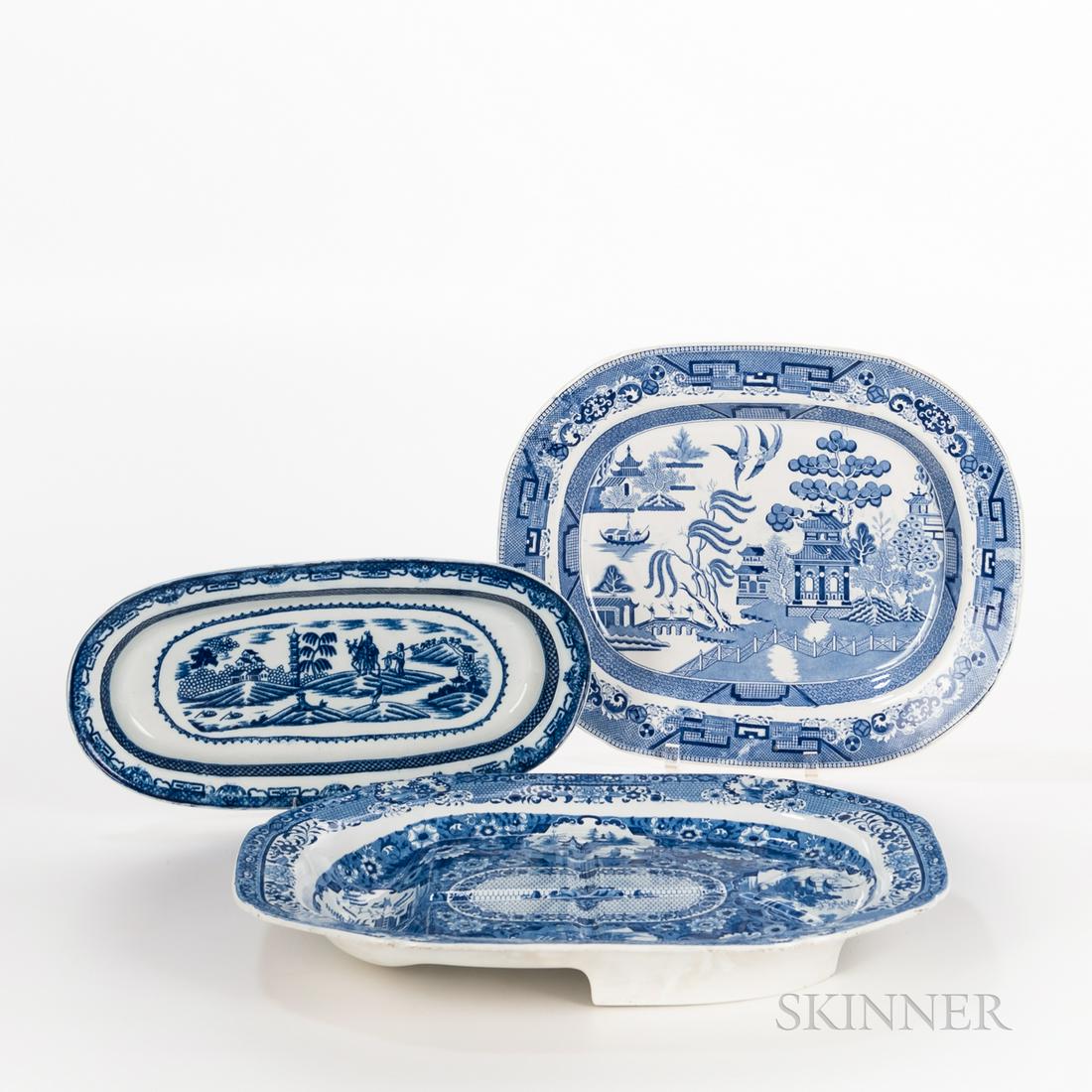 Three Blue Transfer Earthenware Platters, England, c.