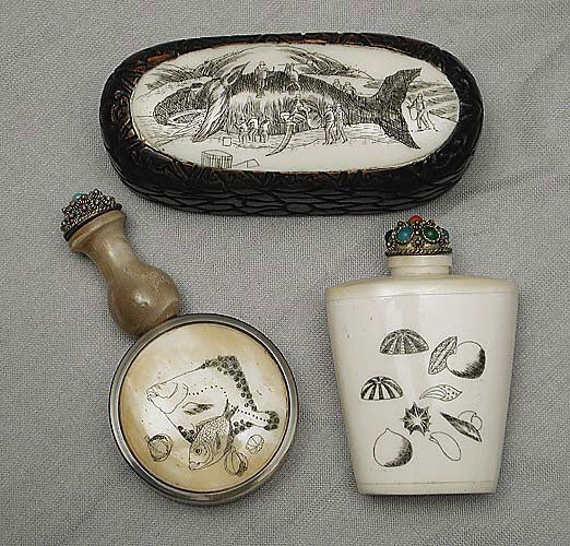 Three bone and scrimshaw items one a ta