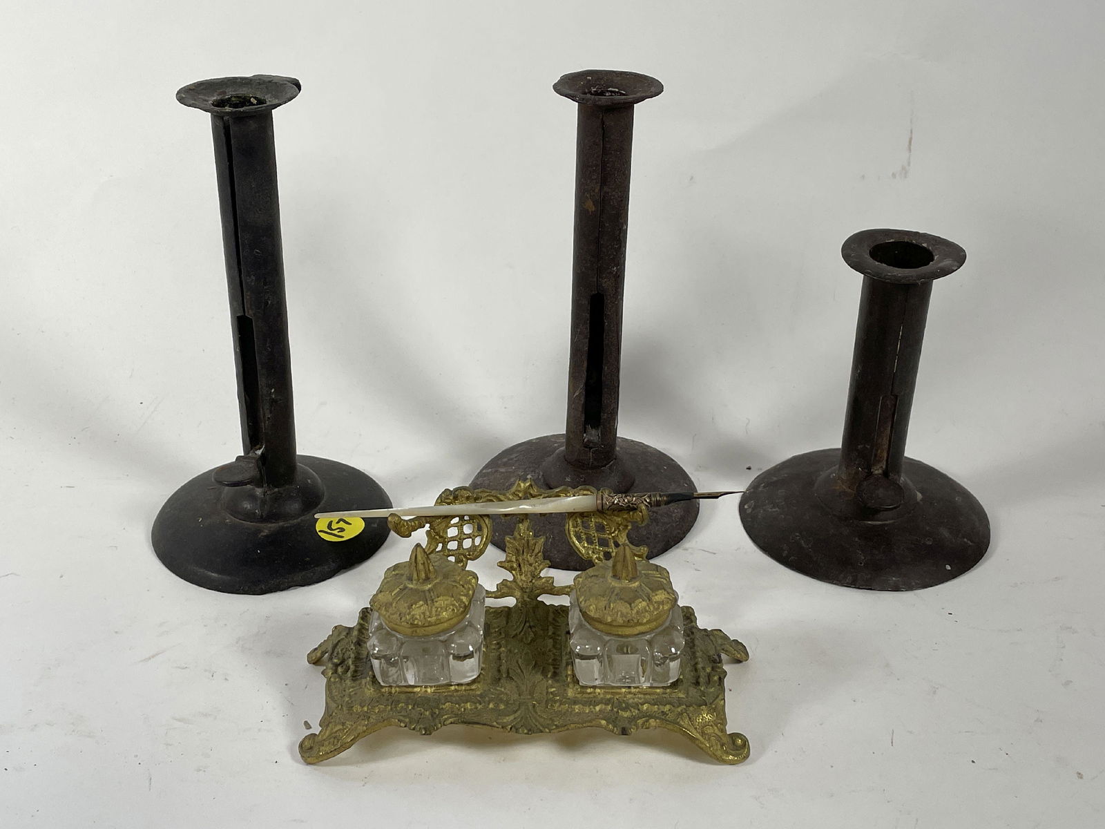 THREE BOOTSCRAPER CANDLESTICKS WITH A BRONZE INKWELL, 7.5" AND SMALLER