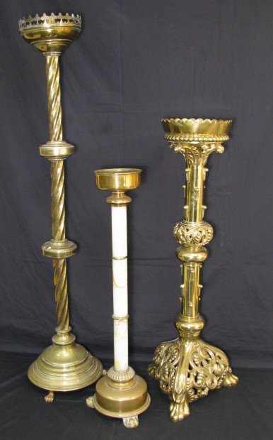 THREE BRASS ALTAR PRICKET CANDLE STANDS