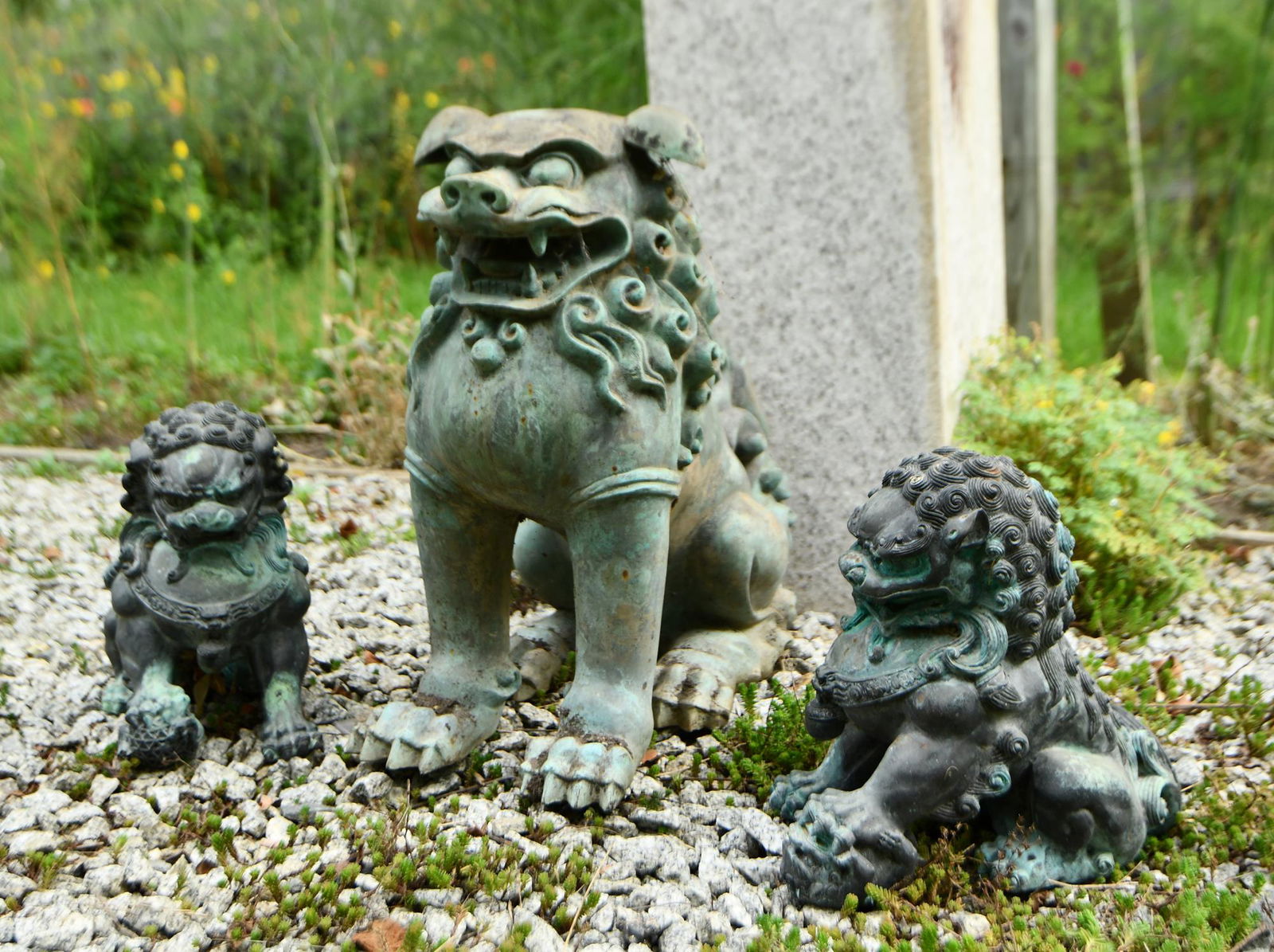 THREE BRONZE FOO LION GARDEN ORNAMENTS.