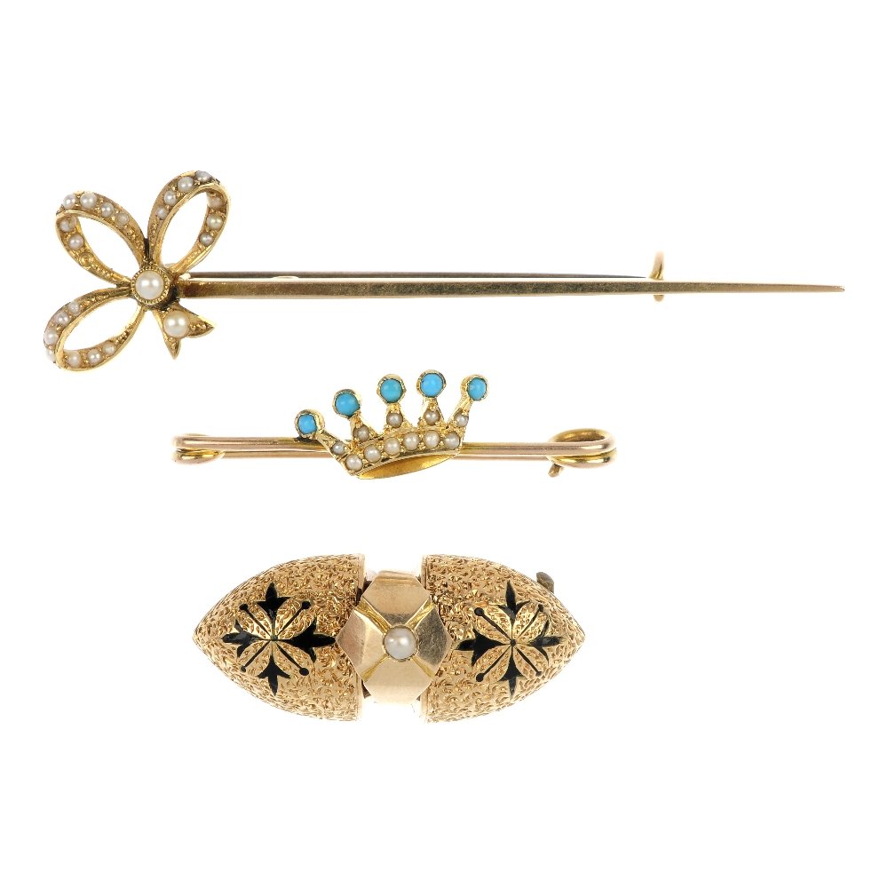 Three brooches, an Albertina and a ring.