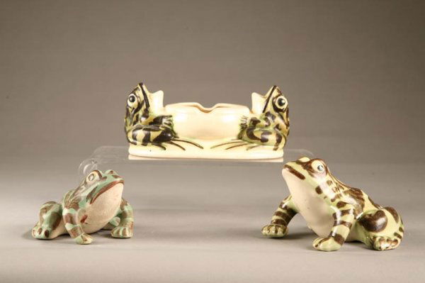 THREE BRUSH MCCOY POTTERY FROGS. One is a double