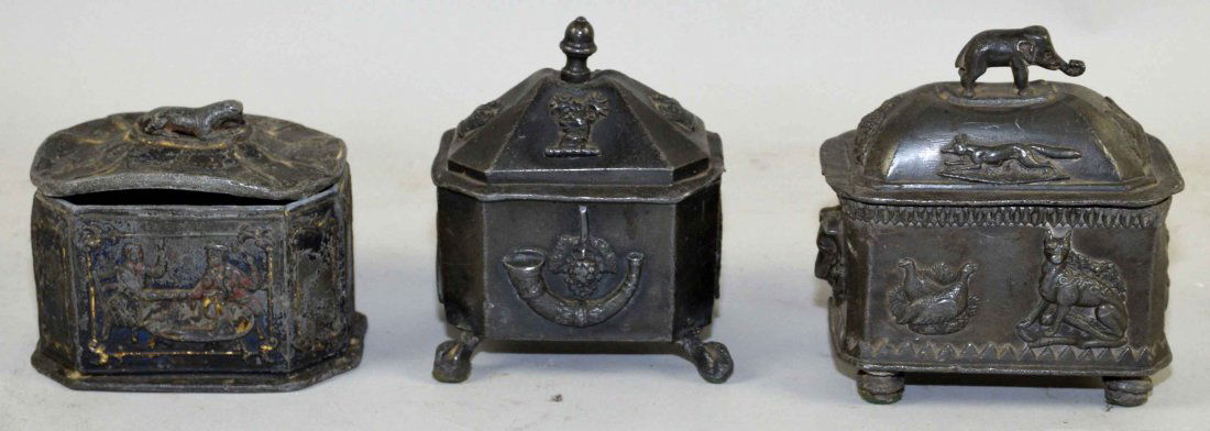 THREE CANTED RECTANGULAR PEWTER HUMIDORS AND COVERS.