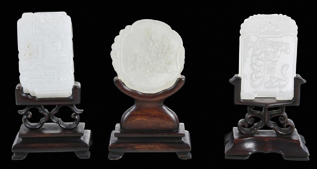 Three Carved Jade Plaques With Stands