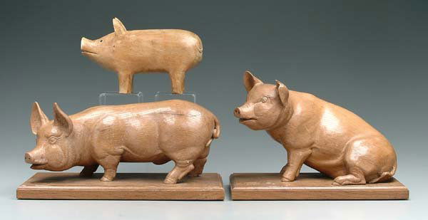 Three carved wooden pigs