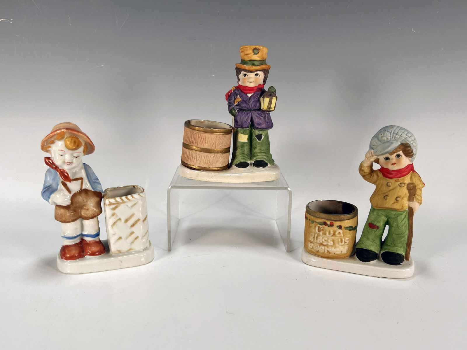 THREE CERAMIC FIGURAL VOTIVE HOLDERS, 2 TINY TIM