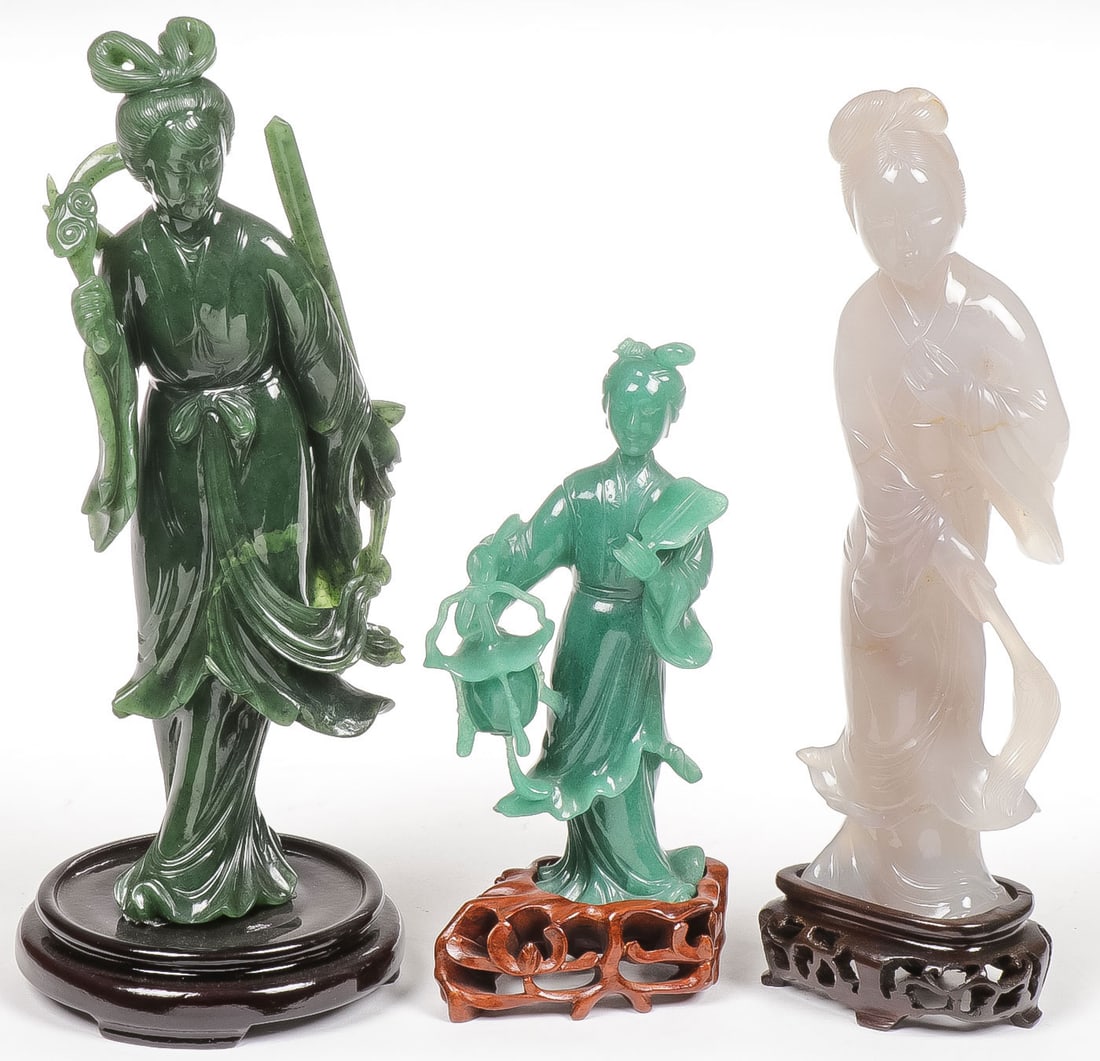 SoldTHREE CHINESE CARVED GREEN JADE FIGURES 20th Century .THREE CHINESE CARVED GREEN JADE FIGURES 20th Century . Largest 5cm Long (3)See Sold Price