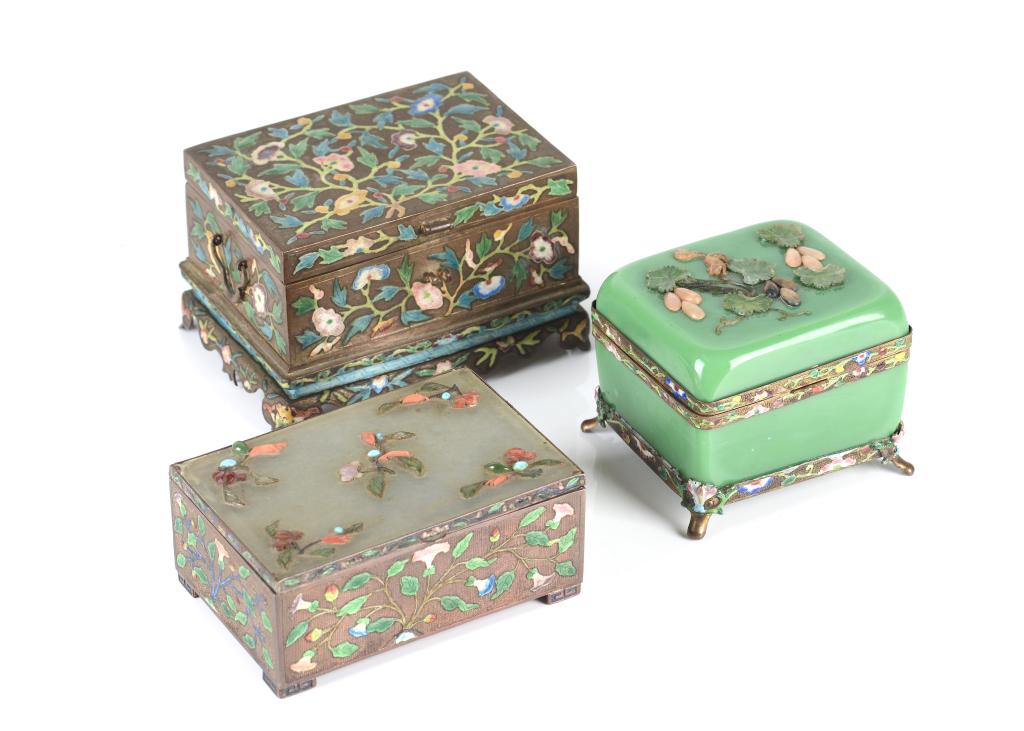 Lot of 4 Trinket BoxesFeb 12, 2026Lot of Three Signed Russian Palekh Jewelry BoxesFeb 08, 2026Lot of Four French Enameled Table BoxesFeb 08, 2026A lot of three variously decorated and shaped Chinese porcelain vasesFeb 24, 2026Chinese Jade Box & Carved Stone Objects 5pc LOT6 days LeftChinese Covered Porcelain BoxesFeb 08, 2026Three Chinese jade-inlaid cloisonne boxes, Republic period or later1 day LeftMatched Pair of Chinese Enamel Boxes Circa 1910s' -A Pair of 2Three Victorian Tunbridge Ware BoxesFeb 21, 2026Three Asian-Style Lacquered Jewelry Chests and Storage Boxes including OtagiriFeb 15, 2026Cloisonné Enamel Hinged Lid Box Incised Qianlong Four-Character MarkFeb 07, 2026CHINESE BRASS AND JADE STONE WOODEN JEWELLERY BOX1 day LeftANTIQUE LACQUER CHINESE BOX WITH SWEETMEAT DISHESFeb 21, 2026Three Chinese Graduated Cloisonne Trinket Boxes6 days LeftChinese Enameled Silver Buddhist Symbol Box with Two Matching Enamel TraysFeb 07, 2026Square Dresser Box, Unmarked Mt. WashingtonFeb 21, 2026