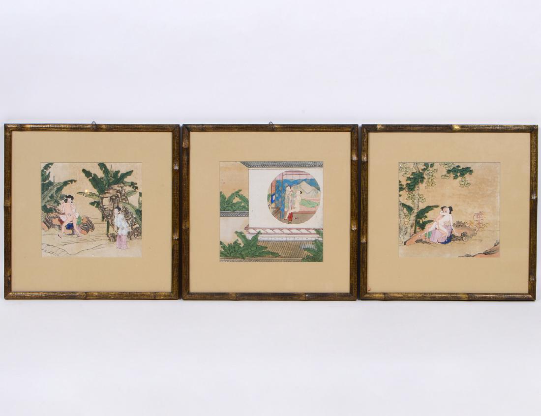 THREE CHINESE EROTIC PAINTED PAPER PANELS