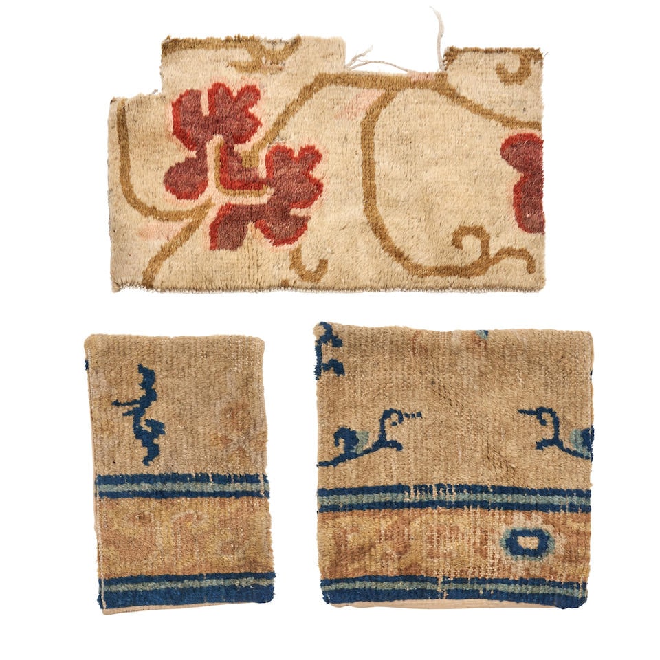 THREE CHINESE RUG FRAGMENTS Various sizes